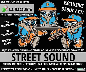 NERJA – In het restaurant van het tennis- en paddlepark La Raqueta aan de N-340 in Nerja (bovenaan de afslag naar Playa Burriana) treedt zondagmiddag 11 april de band Street Sound op. Het optreden begint rond 15.00 uur.