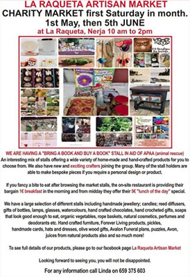 De padel- en tennisclub La Raqueta is te vinden aan de doorgaande weg N-340, tegenover het hotel Nerja Club. De markt duurt van 10.00 tot 14.00 uur, een deel van de opbrengsten komt ten goede aan de dierenstichting APAA. Te koop zijn vooral handgemaakte produkten zoals sierraden, manden, kaarsen en biologisch geteelde groenten en fruit.