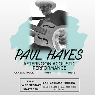 TORROX – In de kustplaats Torrox, op circa tien kilometer van Nerja gelegen, treedt zondagmiddag 25 april de zanger/gitarist Paul Hayes op. Dit beurt bij bar Carisma aan de Paseo de las Moreras in Torrox-Pueblo.