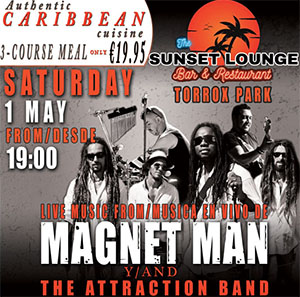 TORROX-PARK – De ‘reggae rock star Magnet Man’ treedt zaterdag 1 mei met zijn begeleidende The Attraction band op in de kustplaats Torrox. Dit gebeurt vanaf 19.00 uur bij bar/restaurant Sunset Lounge.