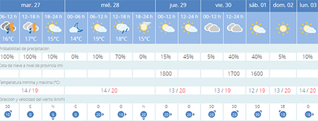 Woensdag bestaat er in de middaguren nog een lichte regenkans, daarna is het volgens de meteorologen voorlopig afgelopen met de neerslag en laat de zon zich meer zien aan de Costa del Sol. De gemiddelde dagtemperaturen schommelen de komende dagen rond de 20 graden Celsius, wél steekt er vanaf woensdag bij tijd en wijle een vrij krachtige wind op.