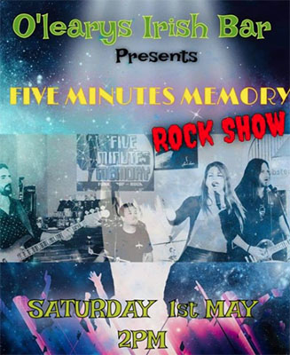 TORROX – De rockband Five Minutes Memory treedt zaterdag 1 mei op in de kustplaats Torrox, op circa tien kilometer van Nerja gelegen. Dit gebeurt bij O’Leary’s Irish Bar aan de Paseo Maritimo de Ferrara.