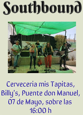 PUENTE DON MANUEL – De formatie Southbound treedt vrijdagmiddag 7 mei op bij de Cerveceria Mis Tapitas aan de Barrio Puente Don Manuel 98 in het dorp Puente Don Manuel, bij het meer van La Vnñuela.