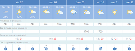 NERJA – De gemiddelde dagtemperaturen rond Nerja lopen de komende dagen iets op. Op vrijdag 7 mei verwachten de meteorologen van het weerstation Aemet (Agencia Estatal de Meteorología) een gemiddelde dagtemperatuur van 24 graden Celsius, op zaterdag 8 mei wordt het zelfs nog iets warmer (25 graden Celsius).
