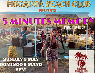TORROX – De band Five Minutes Memory treedt zondag 9 mei op bij de Mogador Beach Club aan de Carretera el Peñoncillo in Torrox. Het optreden begint om circa 17.00 uur.