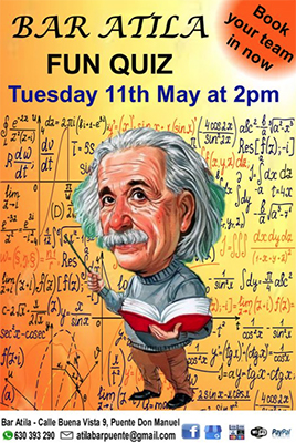 De quiz-afternoon begint dinsdag rond 14.00 uur, bar Atila is te vinden aan de Calle Buena Vista 9 in Puente Don Manuel. Vooraf reserveren is, in verband met de beperkte capaciteit vanwege het Corona-virus, noodzakelijk. Dit kan telefonisch via het nummer 0034 663 393 687 of via e-mail: atilabarpuente@gmail.com.