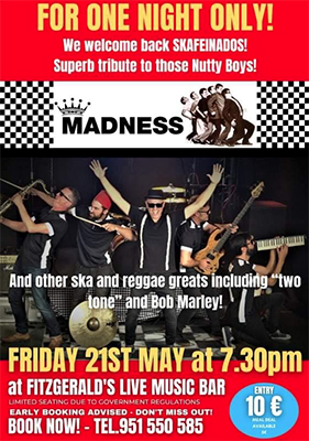 NERJA – De band Skafeinados treedt vrijdagavond 21 mei op bij Fitzgerald’s Bar, op de hoek van park Verano Azul (Calle Antonio Ferrandis Chanquete) onder het pand van de SuperSol supermarkt in Nerja. De formatie brengt daarbij een eerbetoon aan de vermaarde band Madness. Het optreden begint om 19.30 uur.