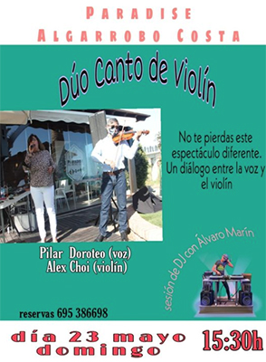 Het optreden vindt plaats bij Chiringuito Paradise vanaf 15.30 uur. Het duo bestaat uit de zangeres Pliar Doroteo en de violist Alex Choi. Vooraf telefonisch reserveren van een plaats is mogelijk via het nummer +34 695 386 698.