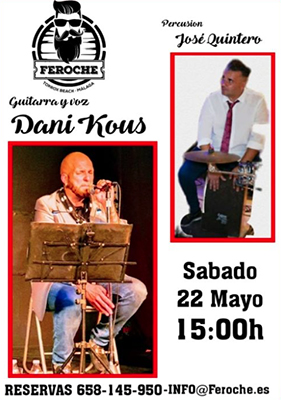TORROX – Het Spaanse duo Dani Kous (zang en gitaar) en José Quintero (drums) is zaterdag 22 mei te beluisteren bij restaurant Feroche in de kustplaats Torrox.