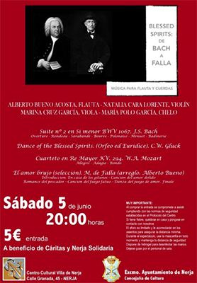 NERJA – In het Centro Cultural Villa de Nerja brengt de muziekgroep Blessed Spirits zaterdagavond 5 juni het concert ‘De Bach a Falla’ ten gehore. Het concert duurt circa anderhalf uur en begint om 20.00 uur, de toegangsprijs is vijf euro per persoon.