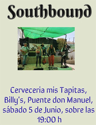 PUENTE DON MANUEL – De formatie Southbound treedt zaterdagavond 5 juni op bij de Cerveceria Mis Tapitas aan de Barrio Puente Don Manuel 98 in het dorp Puente Don Manuel, bij het meer van La Vnñuela.