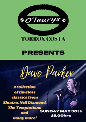TORROX – De zanger Dave Parker treedt zondagmiddag 30 mei op in de kustplaats Torrox, op circa tien kilometer van Nerja gelegen. Parker is dan te beluisteren bij O’Leary’s Irish Bar aan de Paseo Maritimo de Ferrara.