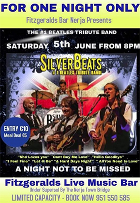 NERJA – Bij Fitzgerald’s Bar, op de hoek van park Verano Azul onder het pand van de SuperSol-supermarkt in Nerja,, treedt zaterdagavond 5 juni de Beatles Tribute Band SilverBeats op.