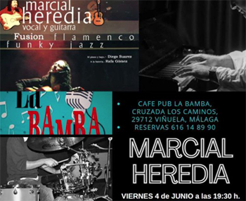 LA VINUELA – De zanger en gitarist Marcial Heredia treedt vrijdagavond 4 juni op bij bar La Bamba in het dorp La Viñuela, naast het gelijknamige meer boven Vélez-Málaga.