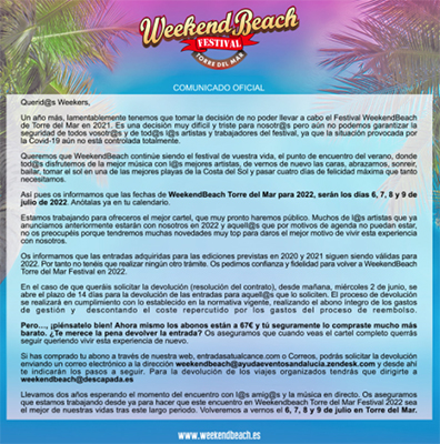 Het jaarlijkse spektakel stond dit jaar gepland van 30 juni tot en met 3 juli. De organisatie heeft inmiddels aangegeven alles in het werk te stellen om de veertiende editie volgend jaar van 6 tot en met 9 juli wél te kunnen houden. Meer informatie over het muziekfestival is te vinden op de website http://www.weekendbeach.es .