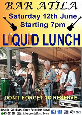 PUENTE DON MANUEL – De band Liquid Lunch is zaterdagavond 12 juni te beluisteren bij bar Atila in het plaatsje Puente Don Manuel, naast het meer van Viñuela (iets boven Vélez-Málaga).