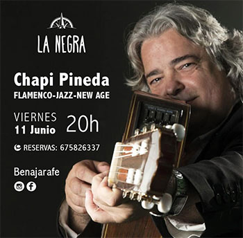 VELEZ MALAGA – Bij de chiringuito La Negra in de kustplaats Vélez-Málaga, op zo’n vijftien kilometer afstand van Nerja, staat vrijdagavond 11 juni een optreden gepland van de flamenco-zanger en gitarist Chapi Pineda.