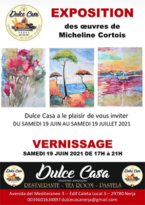 NERJA – Een expositie met werken van Micheline Cortois is tot en met zaterdag 19 juli te zien bij restaurant/tearoom Dulce Casa in Nerja. Deze is gevestigd aan de Avenida del Mediterraneo 3.