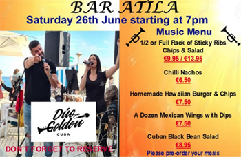 PUENTE DON MANUEL – Bij bar Atila in het plaatsje Puente Don Manuel, naast het meer van Viñuela (iets boven Vélez-Málaga), treedt zaterdagmiddag 26 juni het Dúo Golden Cuba op. Daarbij wordt voornamelijk salsa-, bachata- en merengue-muziek ten gehore gebracht.