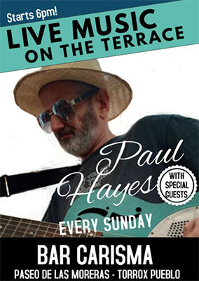TORROX – In de kustplaats Torrox, op circa tien kilometer van Nerja gelegen, treedt zondagmiddag 11 juli de zanger/gitarist Paul Hayes op. Dit gebeurt bij bar Carisma aan de Paseo de las Moreras in Torrox-Pueblo.