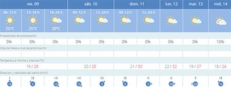 NERJA – In het weer rond Nerja komt de komende dagen weinig verandering. De meteorologen van het weerstation Aemet (Agencia Estatal de Meteorología) voorzien de komende dagen gemiddelde dagtemperaturen van circa 30 graden Celcius, af en toe wat lichte bewolking en weinig wind aan de Costa del Sol.