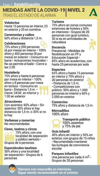 Een en ander houdt onder meer een vroegere sluiting (middernacht) voor de horeca in, alsmede in veel gevallen een limitering naar 75% gebruik van de beschikbare plaatsen (binnen in restaurants en bars, theaters en sportgelegenheden). De bij het niveau-2 horende regelgeving is hier te vinden: https://www.mapacovid.es/detail/Nerja