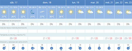 De wind laat het daarbij grotendeels afweten, regen wordt er al helemaal niet verwacht aan de Costa del Sol voor de komende dagen. Waar de gemiddelde dagtemperatuur op zaterdag 17 juli circa 28 graden zal zijn volgens de meteorologen, ligt deze voor zondag 18 juli nog zo´n vier graden hoger met een gemiddelde waarde van 32 graden Celsius. Vanaf dinsdag 20 juli verschijnt er iets meer bewolking boven Nerja en omstreken, veel gevolgen voor de temperaturen (gemiddeld circa 30 graden) heeft dat niet.