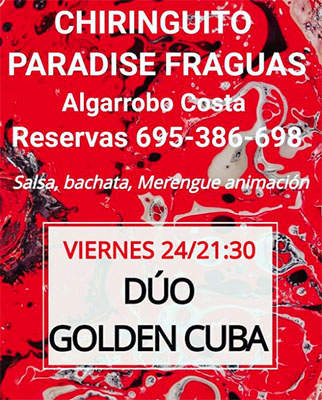 Het optreden vindt plaats vanaf 21.30 uur. Vooraf telefonisch reserveren van een plaats is mogelijk via het nummer +34 695 386 698. Dúo Golden brengt onder meer salsa- en bachata-muziek ten gehore.