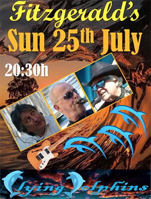 NERJA – De regionaal vermaarde band The Flying Dolphins treedt zondagavond 25 juli weer op bij Fitzgerald’s Bar, op de hoek van park Verano Azul (Calle Antonio Ferrandis Chanquete) onder het pand van de SuperSol-supermarkt in Nerja.