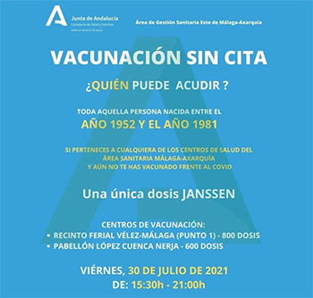 NERJA – Na de eerdere vaccinatie-actie van vorige week is er deze week opnieuw een mogelijkheid tot inenting tegen Covid-19 (Janssen-vaccin) in Nerja en Vélez-Málaga, zónder afspraak. Om deel te nemen aan deze gratis vaccinatie-mogelijkheid is inschrijving bij één van de gezondheidscentra in het district Málaga-Axarquia verplicht én moet de geboortedatum vallen tussen 1952 en 1981.