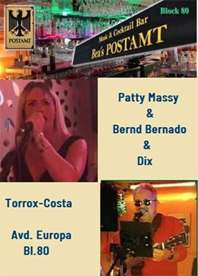 TORROX – De zangeres Patty Massy en de gitarist/zanger Bernd Bernado treden zaterdagavond 7 augustus op bij de Music & Cocktail Bar Bea’s Postamt in de kustplaats Torrox. De bar is te vinden aan de Avenida Europa (Bloque 80).