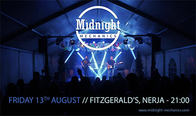 NERJA – De band Midnight Mechanics treedt vrijdagavond 13 augustus op bij Fitzgerald’s Bar, op de hoek van park Verano Azul onder het pand van de SuperSol supermarkt in Nerja.