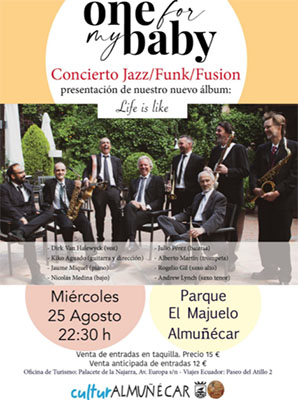 ALMUNECAR – De uit acht muzikanten bestaande band ‘One for my Baby’ van de Belgische zanger Dirk Van Halewyck verzorgt woensdagavond 25 augustus een mini-concert in het Parque El Majuelo van de kustplaats. De band brengt naast eigen werk van de CD ‘Life is like’ vooral jazz-, funk- en fusioncovers ten gehore.