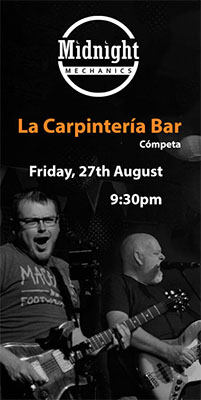COMPETA – De band Midnight Mechanics treedt vrijdagavond 27 augustus op bij La Carpinteria Bar in de plaats Cómpeta. Bij deze band speelt onder anderen de in Nerja en directe omgeving veel optredende zanger/gitarist Lee Townsend.