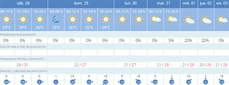 De gemiddelde dagtemperatuur is voor zaterdag volgens de verwachtingen 31 graden Celsius, met ingang van zondag en voor de gehele volgende week voorzien de weerkundigen gemiddelde waardes van 27 graden Celsius. Van wind is daarbij nauwelijks sprake, de kans op neerslag lijkt voor de komende week zo goed als nihil.