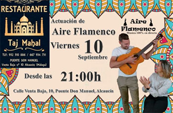 PUENTE DON MANUEL – De formatie Aire Flamenco treedt vrijdagavond 10 september op bij Restaurante Taj Mahal in Puente Don Manuel. Het optreden begint rond 21.00 uur.