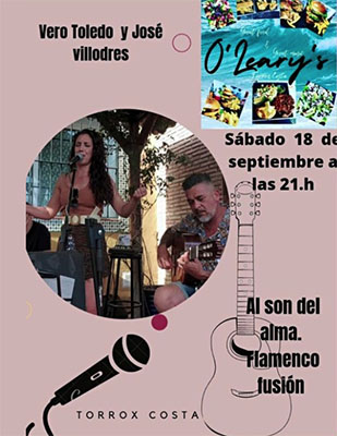TORROX-COSTA – Het flamenco-duo Vero Toledo en José Villodres treedt zaterdagavond 18 september op bij O’Leary’s Irish Bar aan de Paseo Marítimo de Ferrara in de kustplaats Torrox.