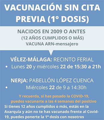 NERJA – Na de eerdere vaccinatie-acties in juli en augustus is er volgende week opnieuw een mogelijkheid tot inenting tegen het Covid-19 virus in Nerja en Vélez-Málaga, zónder afspraak.