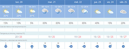 De temperaturen blijven daarbij de komende dagen schommelen rond maxima van circa 25 graden Celsius. Wel neemt met ingang van dinsdag 21 september de wind in kracht toe. Voor maandag 20 september is er wel bewolking voorzien maar lijkt daaruit geen regen te vallen. De dagen daarna is die regenkans volgens de meteorologen beduidend groter.
