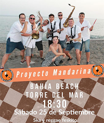 TORRE DEL MAR – De regionaal vermaarde en populaire ska- en reggaeband Proyecto Mandarina speelt zaterdagavond 25 september bij bar Bahía Beach aan de Paseo Marítimo in de kustplaats Torre del Mar, tussen Nerja en Málaga.