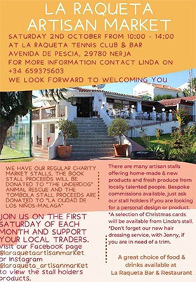 De padel- en tennisclub La Raqueta is te vinden aan de doorgaande weg N-340 (Avenida de Pescia), tegenover het hotel Nerja Club. De markt duurt van 10.00 tot 14.00 uur, een deel van de opbrengsten komt ten goede aan de dierenstichting APAA. Te koop zijn vooral handgemaakte produkten zoals sierraden, manden, kaarsen en biologisch geteelde groenten en fruit.