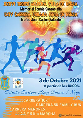 Beide evenementen staan in het kader van het jaarlijkse Féria de Nerja. De Carrera Urbana start om 10.00 uur, de Trofeo Marcha Villa de Nerja begint zondag 3 oktober om 11.45 uur. De start voor beide evenementen ligt in het Enrique López Cuenca-atletiekstadion van Nerja (aan de doorgaande weg N-340, nét boven de afslag naar Playa Burriana). De organisatie is in handen van de lokale atletiekclub Nerja Atletismo.