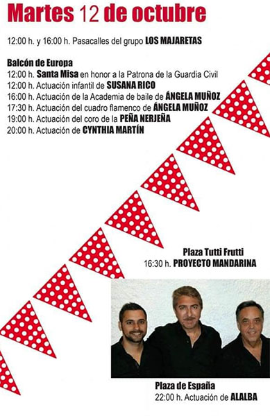 De band Alalba verzorgt het afsluitende optreden rond de grote gemeentelijke feesttent op het Plaza de España vanaf 22.00 uur, de uit Nerja afkomstige ska- en reggaeband Proyecto Mandarina speelt vanaf 16.30 uur op het uitgaansplein Tutti Frutti.