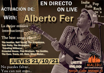 Gitarist Alberto Fer bij cocktailbar Malibú NERJA – De gitarist Alberto Fer treedt donderdagavond 21 oktober op in cocktailbar Malibú aan de Calle Málaga 13 in Nerja. Fer brengt daarbij vooral pop-, rock- en folkmuziek ten gehore. Het optreden bij Malibú begint rond de klok van 21.00 uur. Delen: Klik om te delen op X (Opent in een nieuw venster) X Klik om te delen op Facebook (Opent in een nieuw venster) Facebook Vind-ik-leuk Aan het laden...