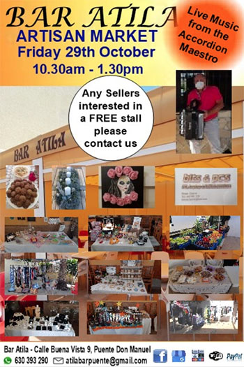 Bar Atila is te vinden aan de Calle Buena Vista 9 in Puente Don Manuel. De markt begint om 10.30 uur en duurt tot circa 13.30 uur. Op de Artisan Markt worden allerlei handgemaakte artikelen, sierraden en voedsel te koop aangeboden.