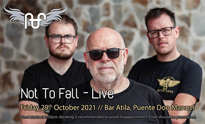 PUENTE DON MANUEL – De formatie Not To Fall treedt vrijdagavond 29 oktober op bij bar Atila in het plaatsje Puente Don Manuel, naast het meer van Viñuela (iets boven Vélez-Málaga). Tot de bandleden behoort onder anderen de regionaal bekende zanger/gitarist Lee Townsend.