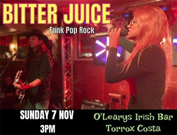 TORROX – De Argentijnse soulband Bitter Juice (met onder anderen de in deze regio veel solo optredende broer en zus Ger en Rose Philippens) treedt zondagmiddag 7 november op in de kustplaats Torrox, op circa tien kilometer van Nerja gelegen. Dit gebeurt in O’Leary’s Irish Bar aan de Paseo Maritimo de Ferrara.