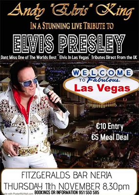 NERJA – De zanger Andy King brengt donderdagavond 11 november een Elvis Presley-tribute in Nerja bij Fitzgerald’s Bar, op de hoek van park Verano Azul onder het pand van de Super Sol-supermarkt in Nerja.