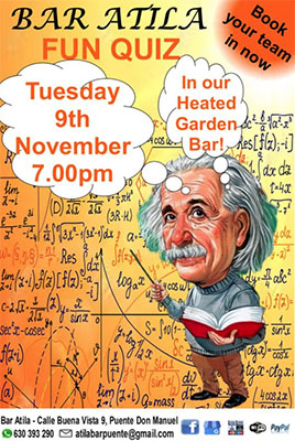 De quiz begint dinsdagavond rond 19.00 uur, bar Atila is te vinden aan de Calle Buena Vista 9 in Puente Don Manuel. Vooraf reserveren wordt aangeraden. Dit kan telefonisch via het nummer (+34) 630 393 290 of via e-mail: atilabarpuente@gmail.com.