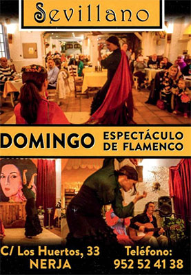 NERJA –Bij bar/restaurant Los Huertos del Sevillano aan de Calle Los Huertos 33 in Nerja staat zondag 14 november een spectaculaire flamenco-avond geprogrammeerd.